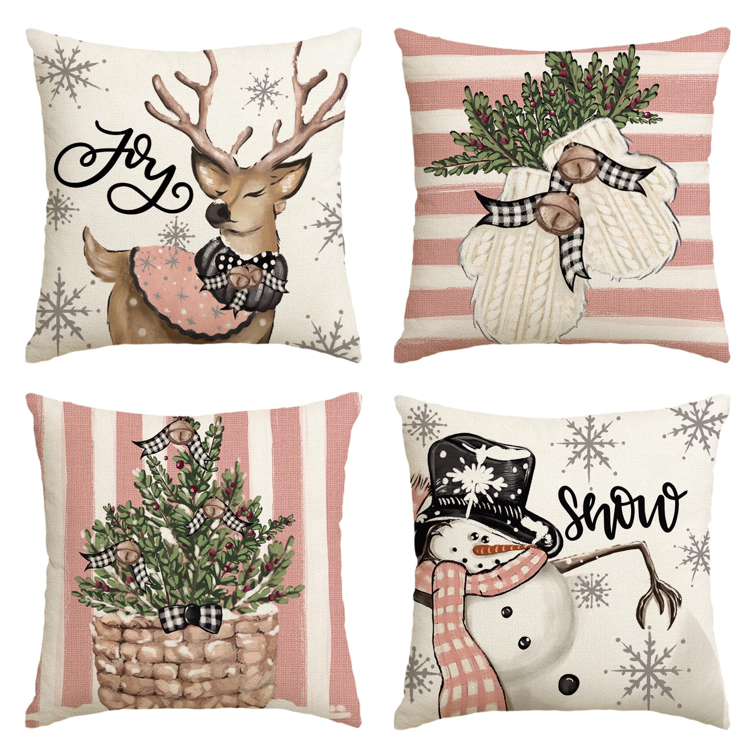 Christmas Snowman Reindeer Gloves Eucalyptus Throw Pillow Covers Set of 4