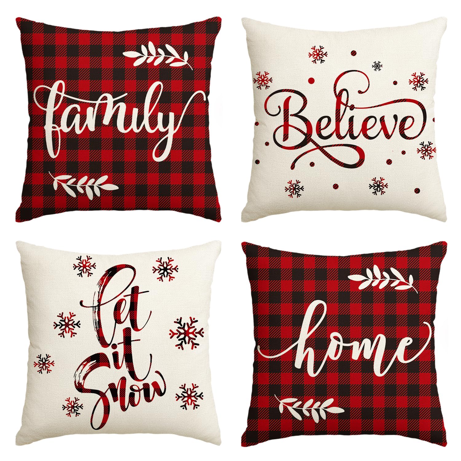 Christmas Saying Buffalo Plaid Throw Pillow Cover, 18 x 18 Inch Winter Holiday Farmhouse Cushion Case for Sofa Couch Set of 4