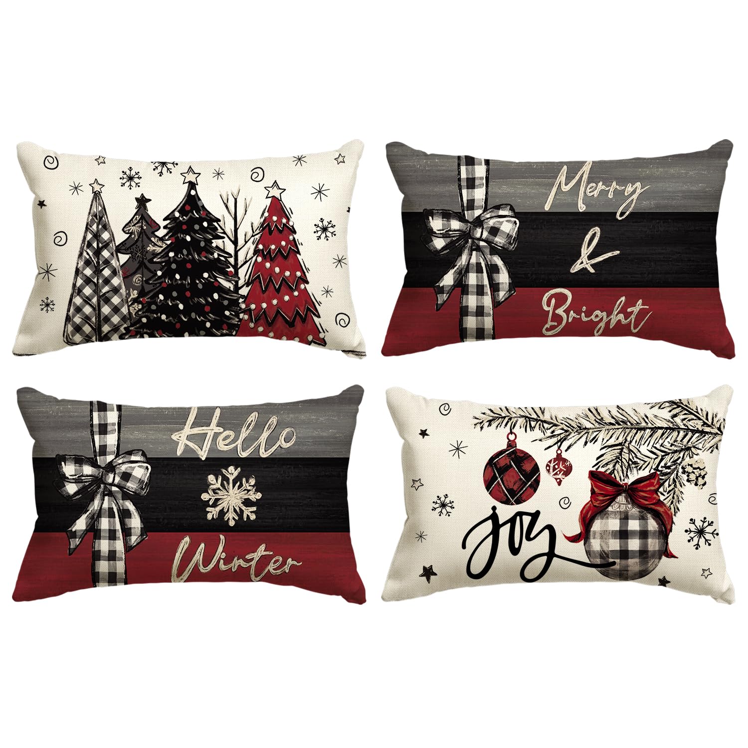 Merry Christmas Joy Xmas Trees Red Throw Pillow Covers, 12 x 20 Inch Christmas Winter Holiday Cushion Case Decoration for Sofa Couch Set of 4