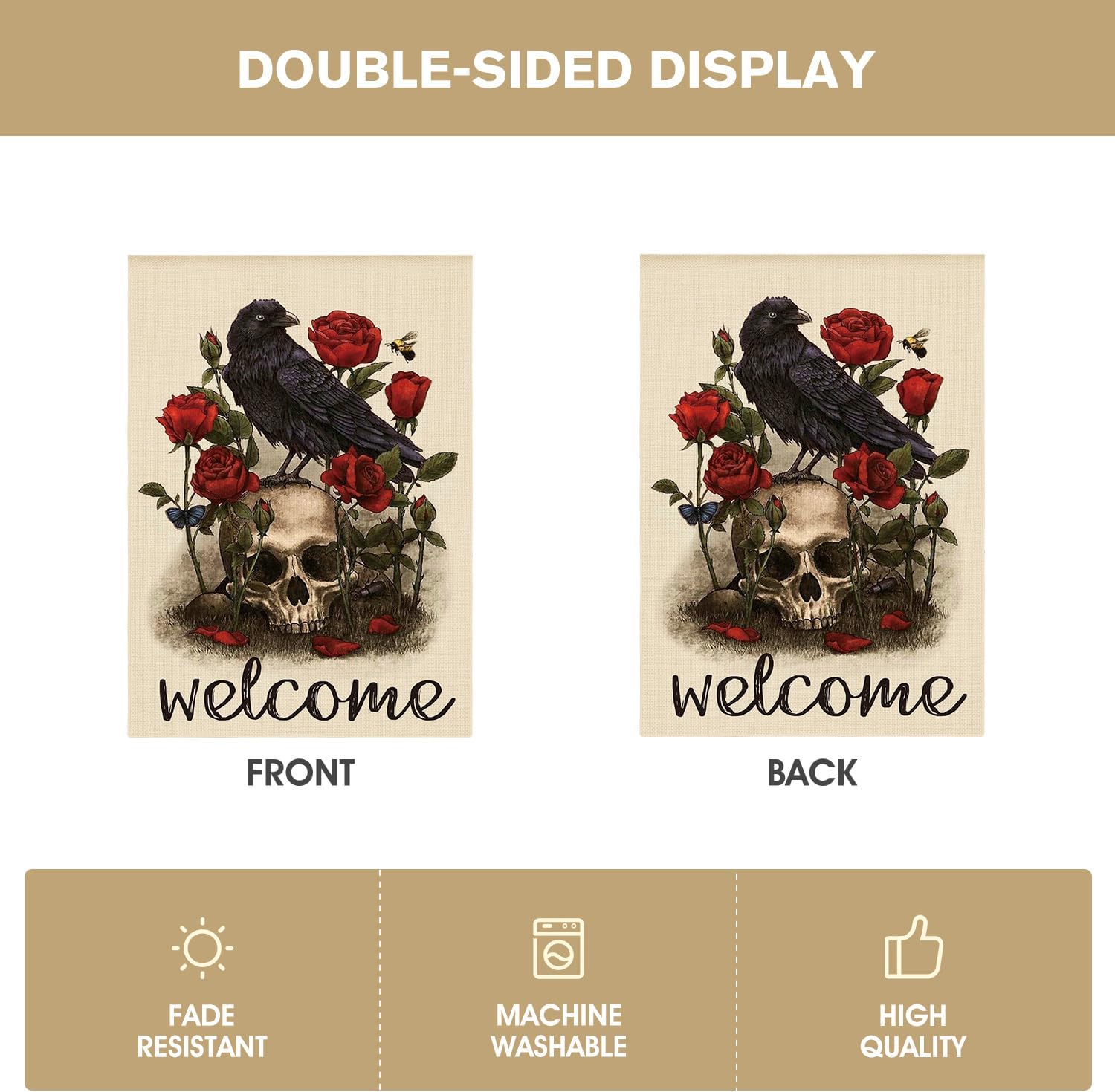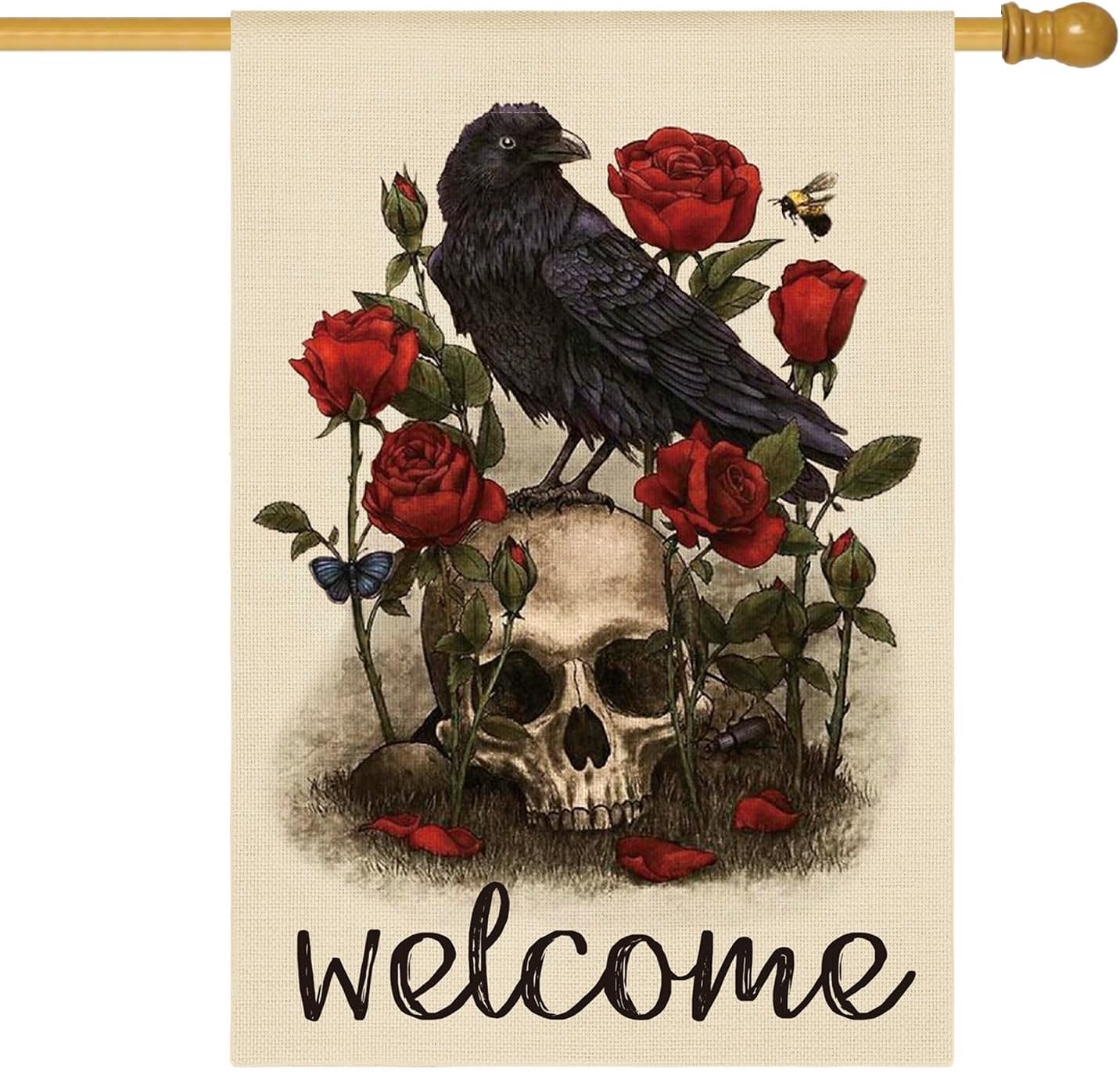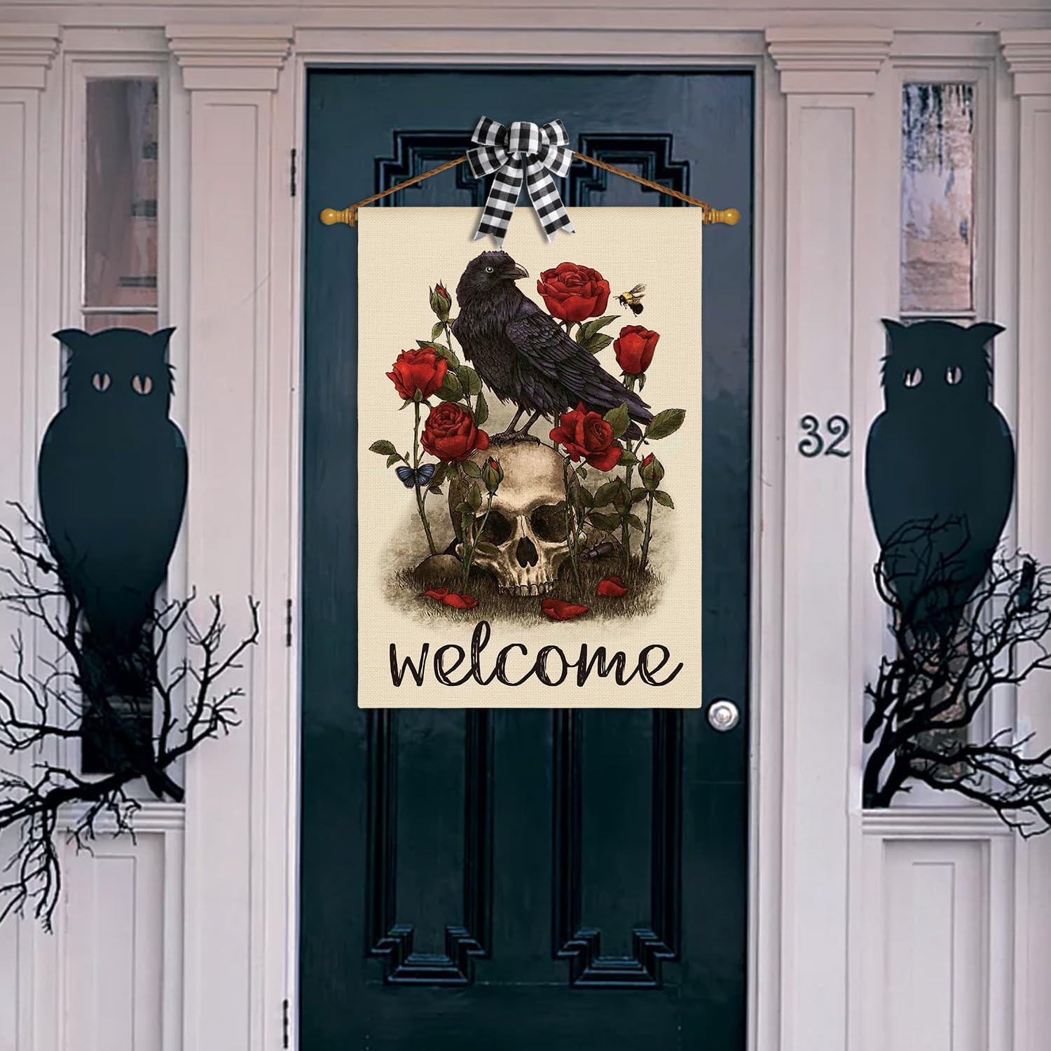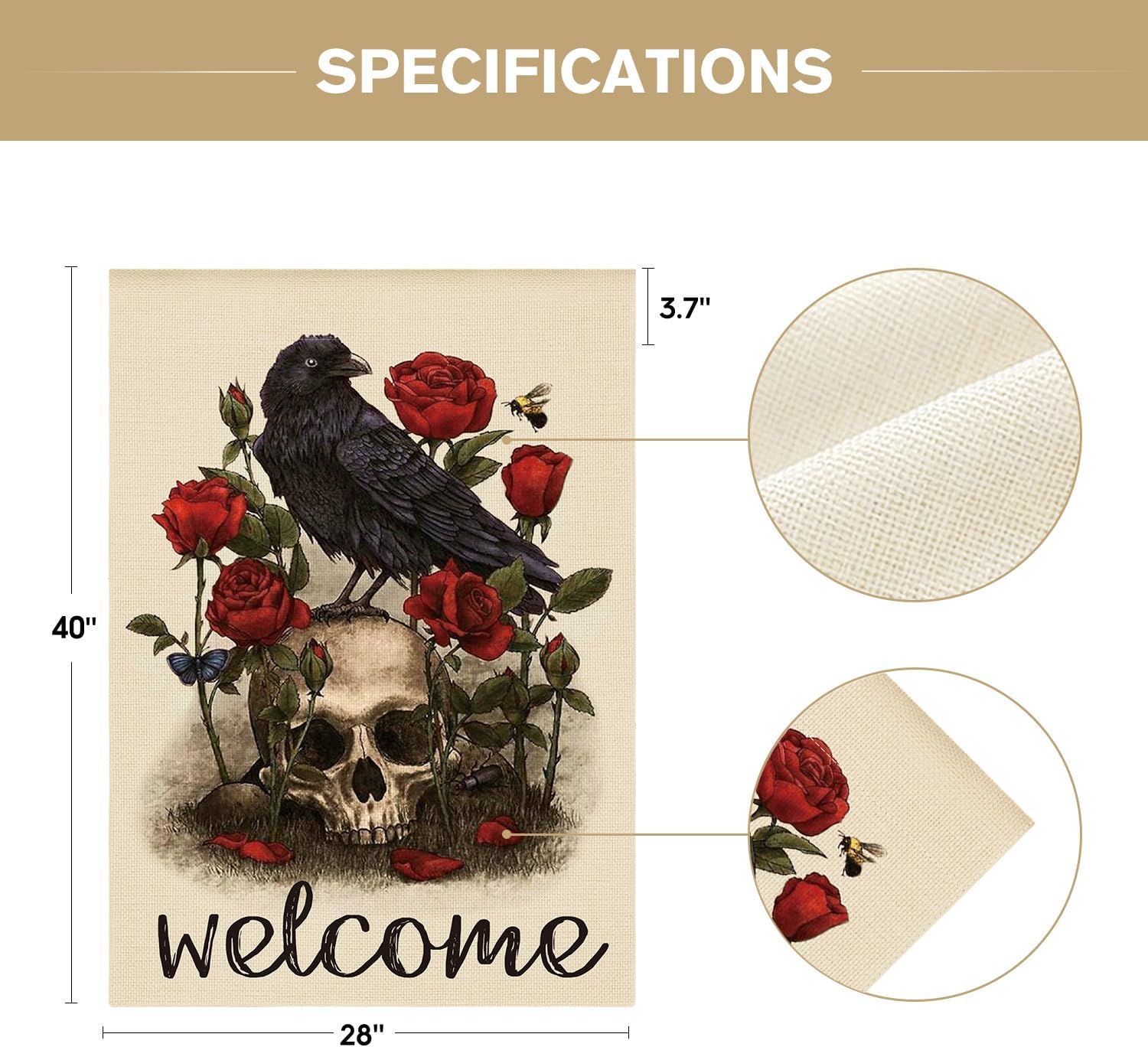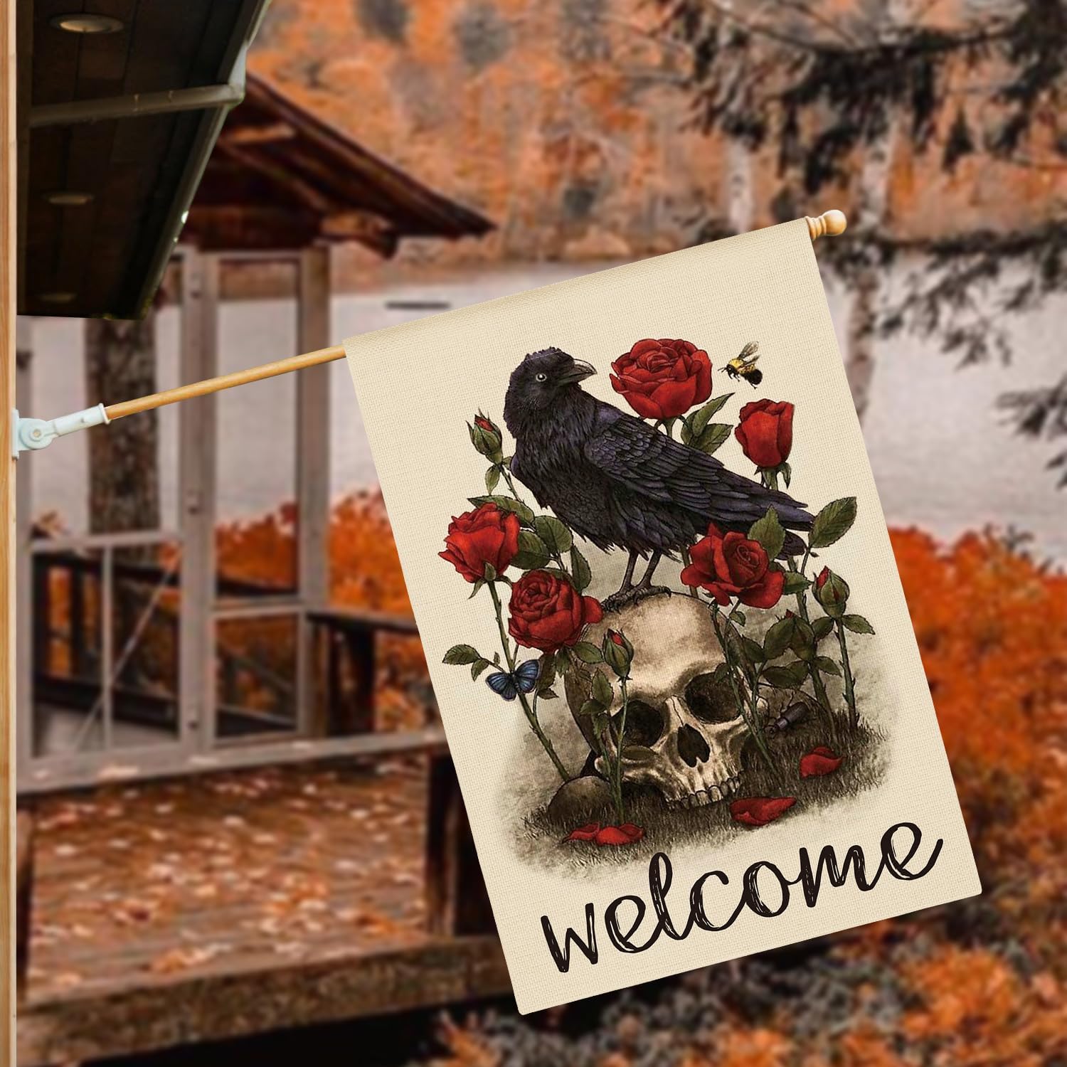 AVOIN colorlife Halloween Welcome Skull Rose Crow House Flag Double Sided, Day of the Dead Holiday Yard Outdoor Decorative Flag 28 x 40 Inch