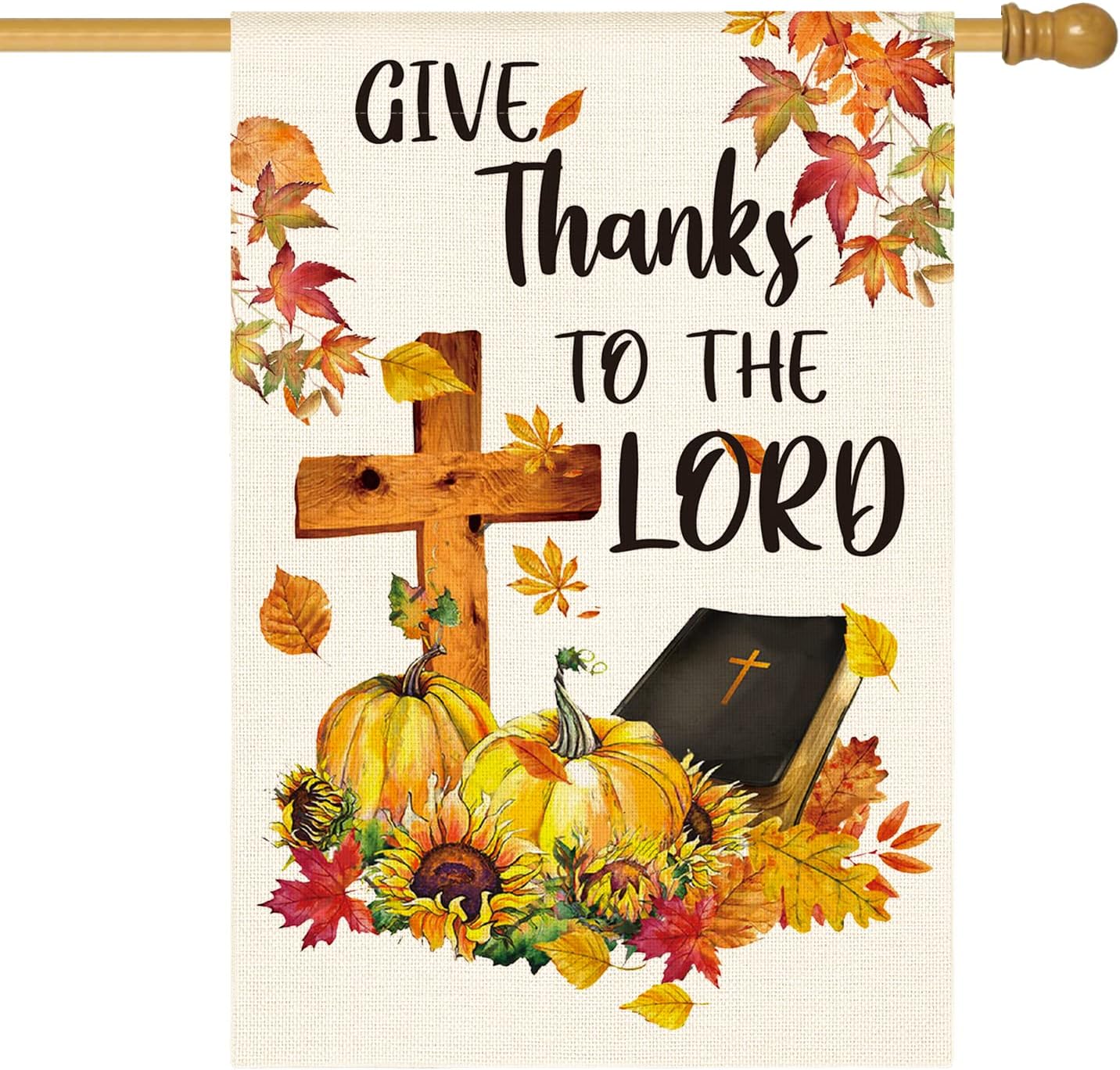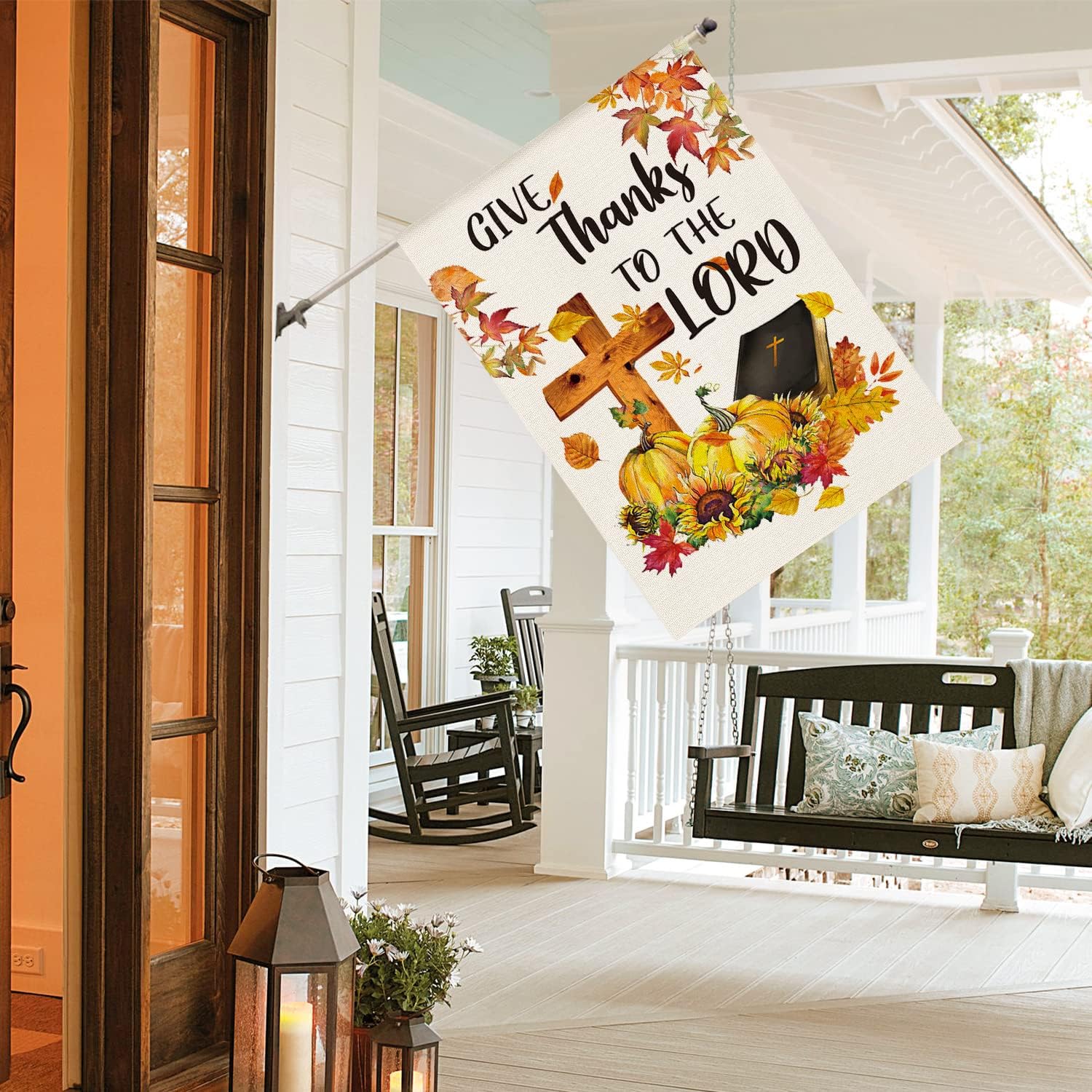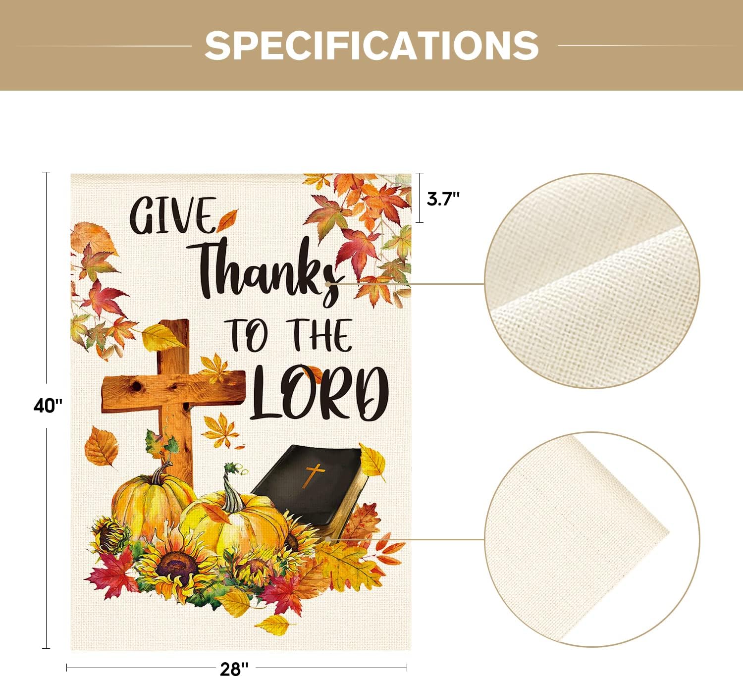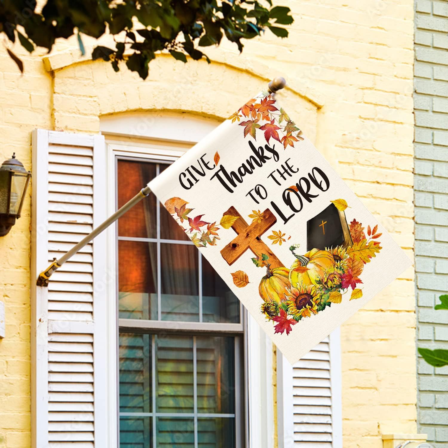 AVOIN colorlife Fall Thanksgiving Give Thanks to The Lord House Flag 28 x 40 Inch Double Sided, Pumpkin Maple Leaf Harvest Holiday Yard Outdoor Decorative Flag