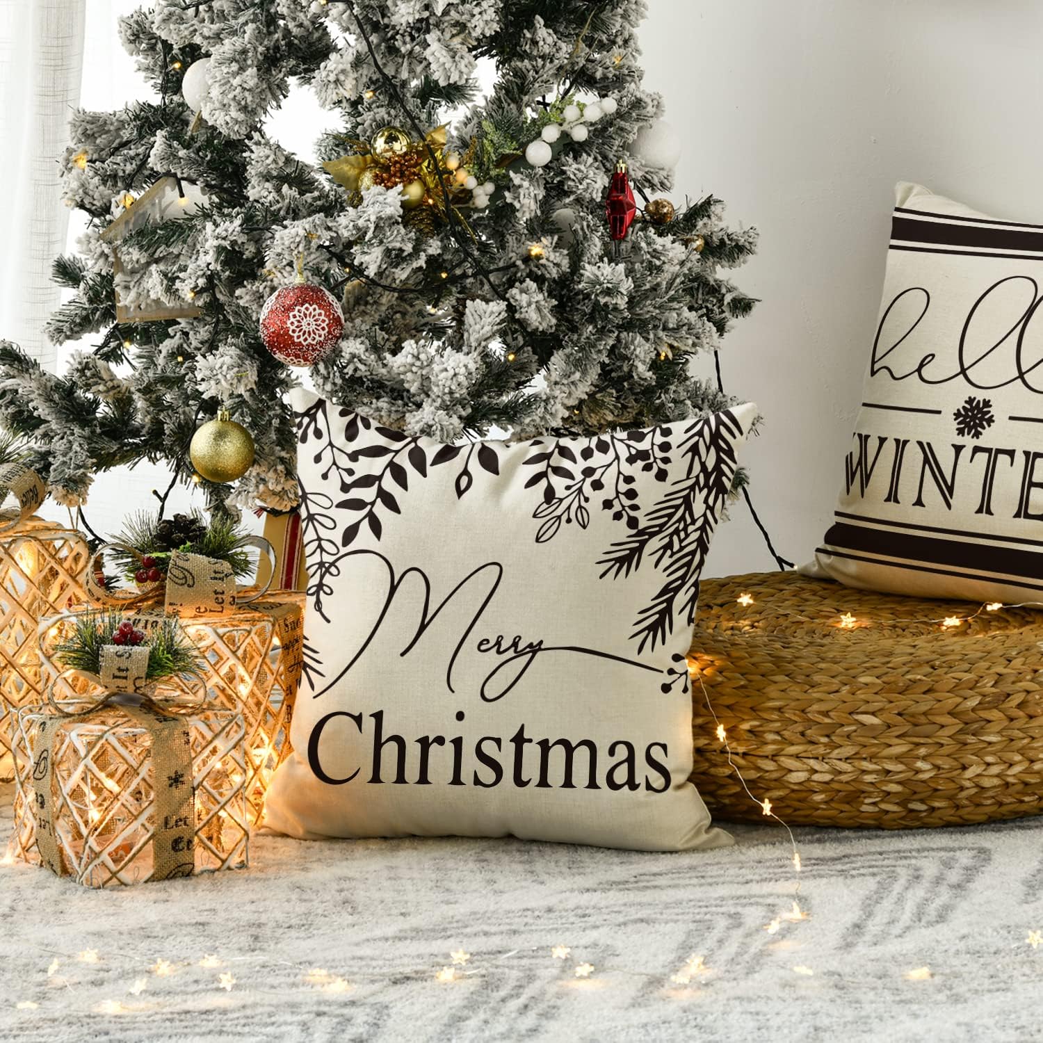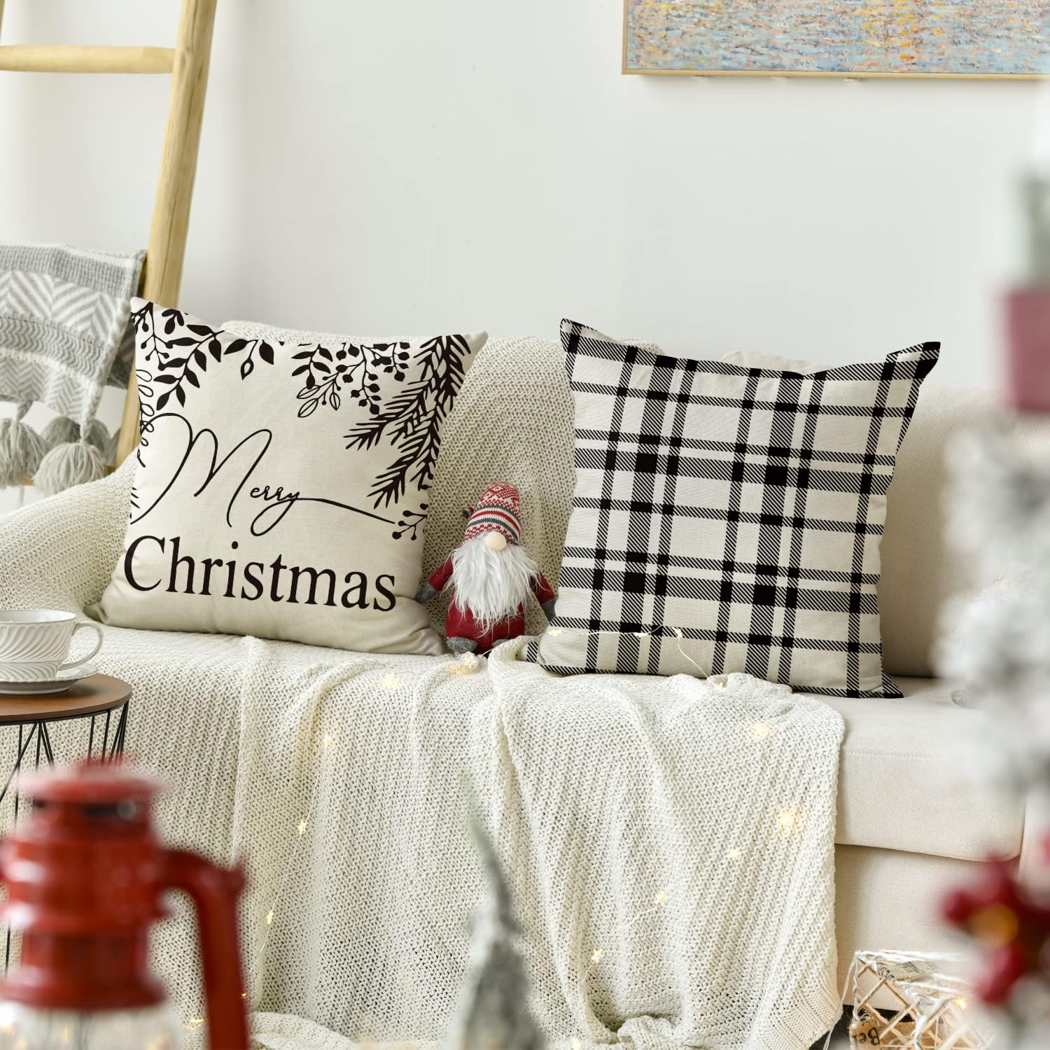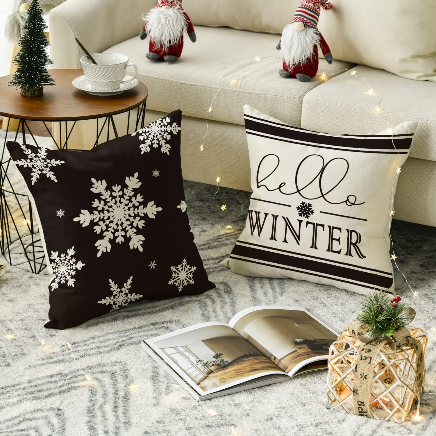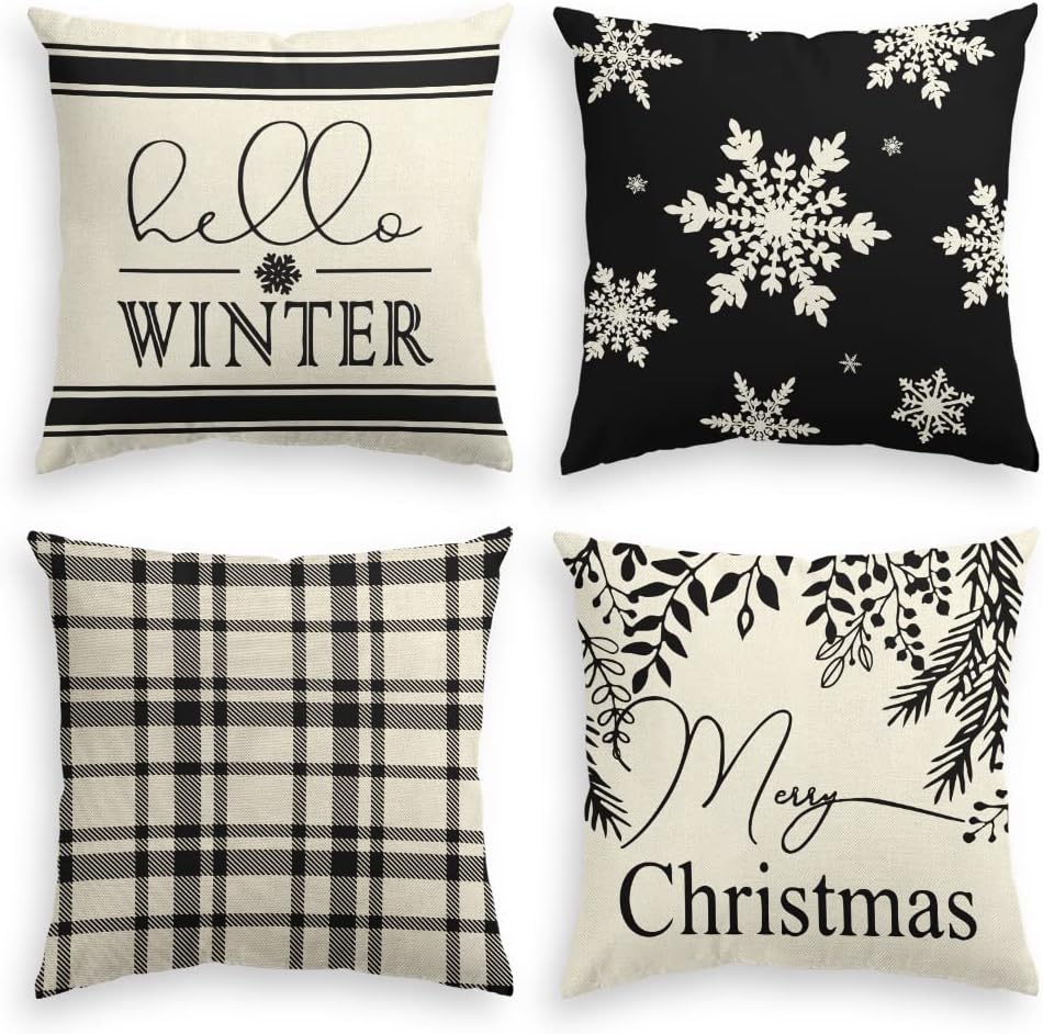 AVOIN colorlife Merry Christmas Hello Winter Buffalo Plaid Snowflake Throw Pillow Cover, 18 x 18 Inch Winter Holiday Cushion Case Decoration for Sofa Couch Set of 4