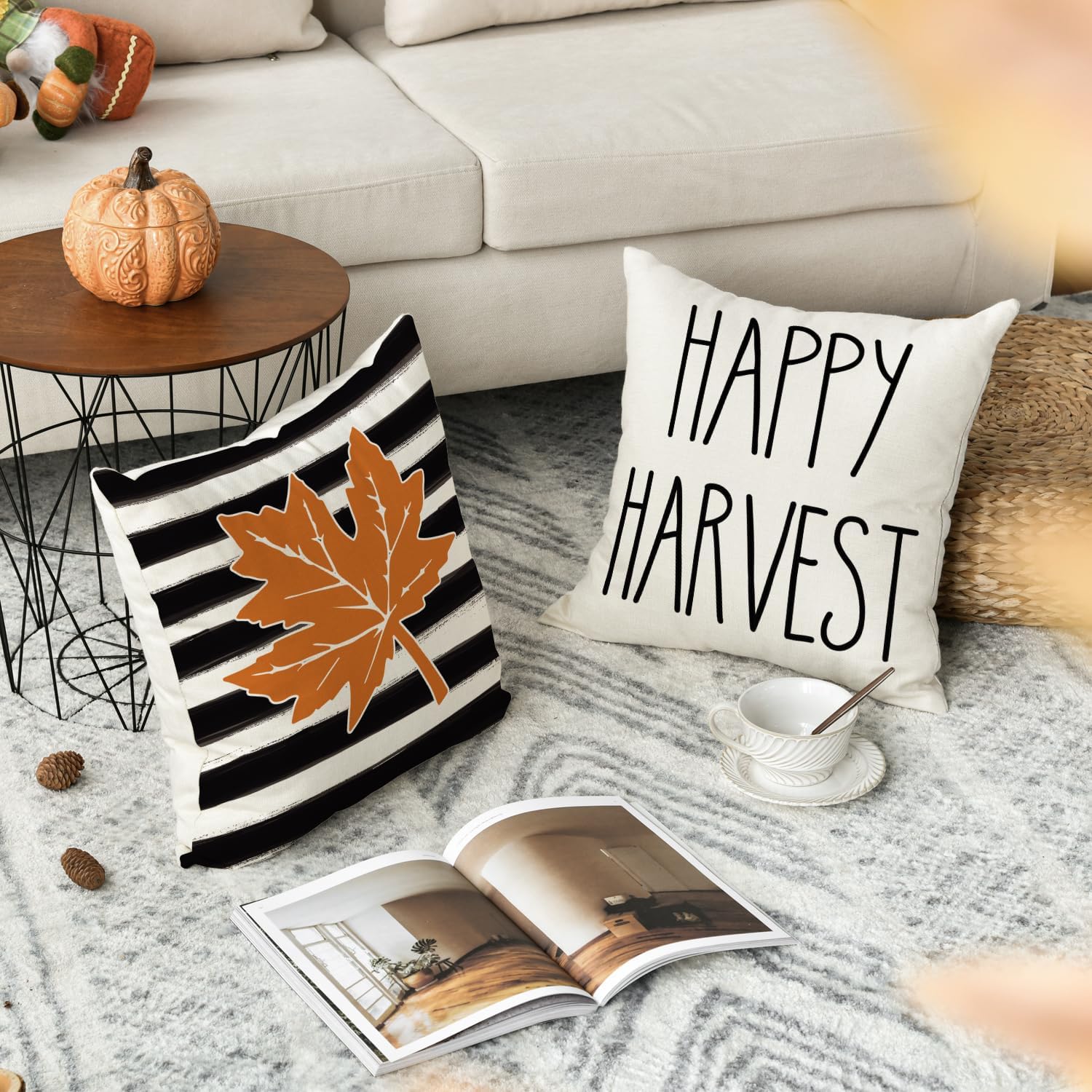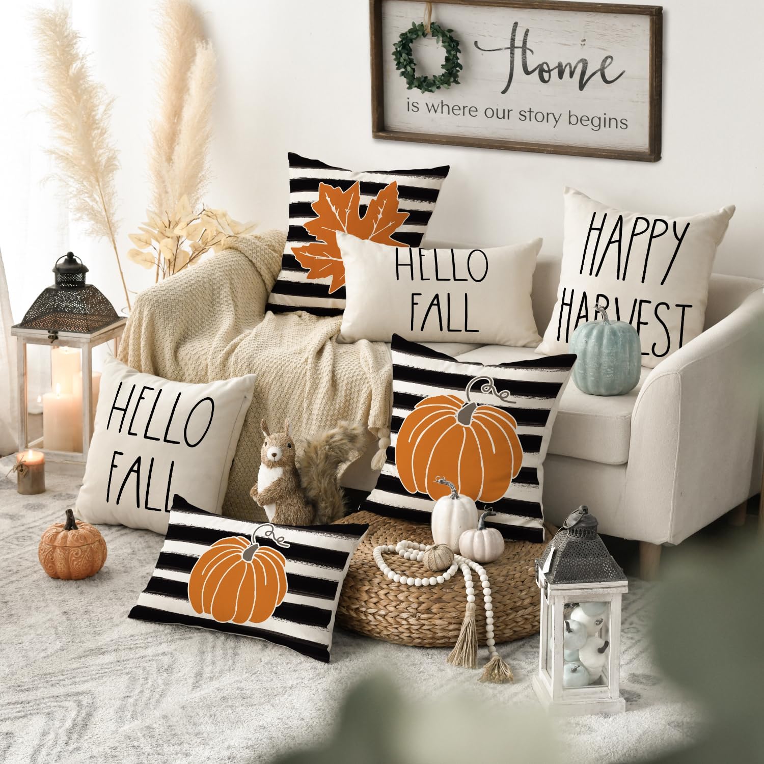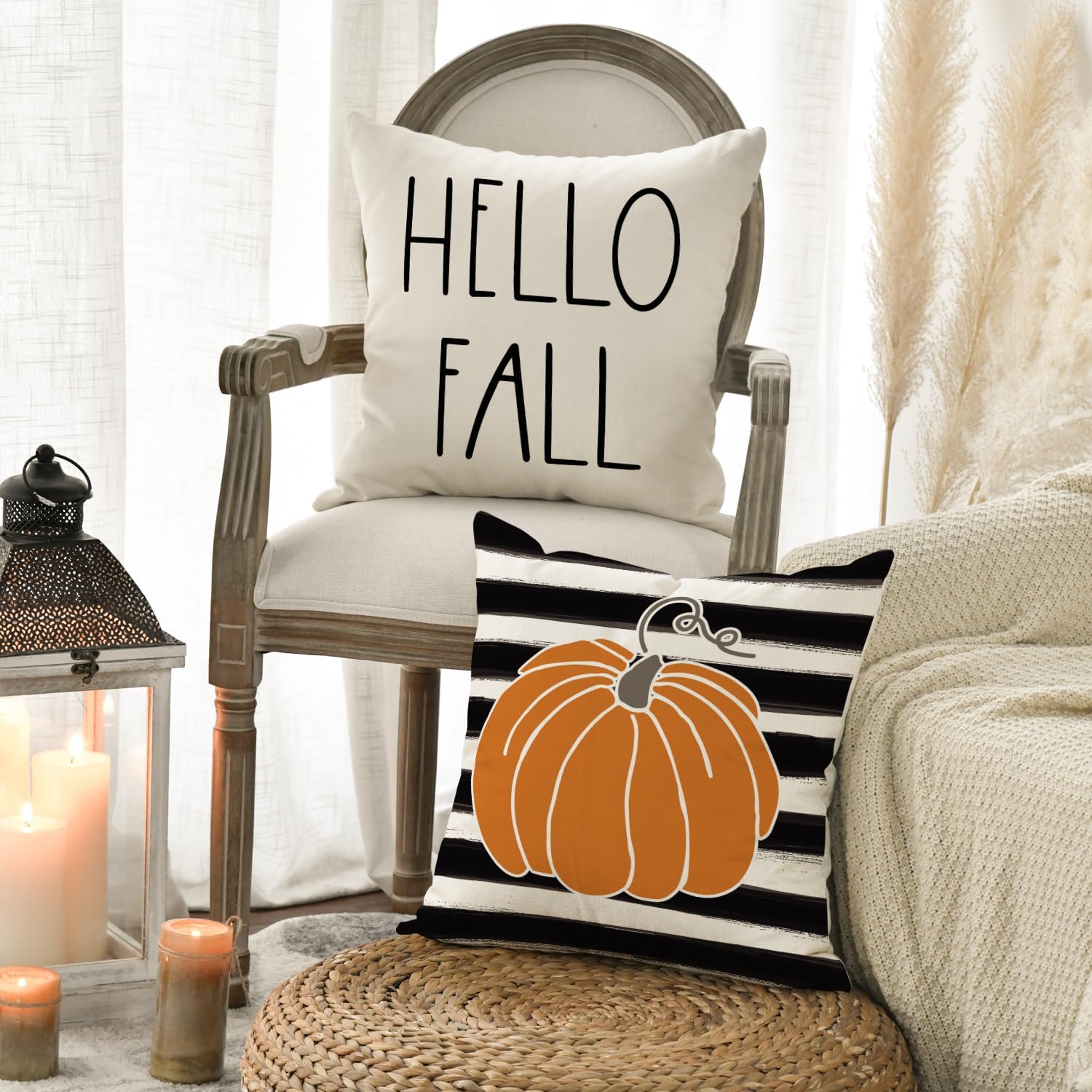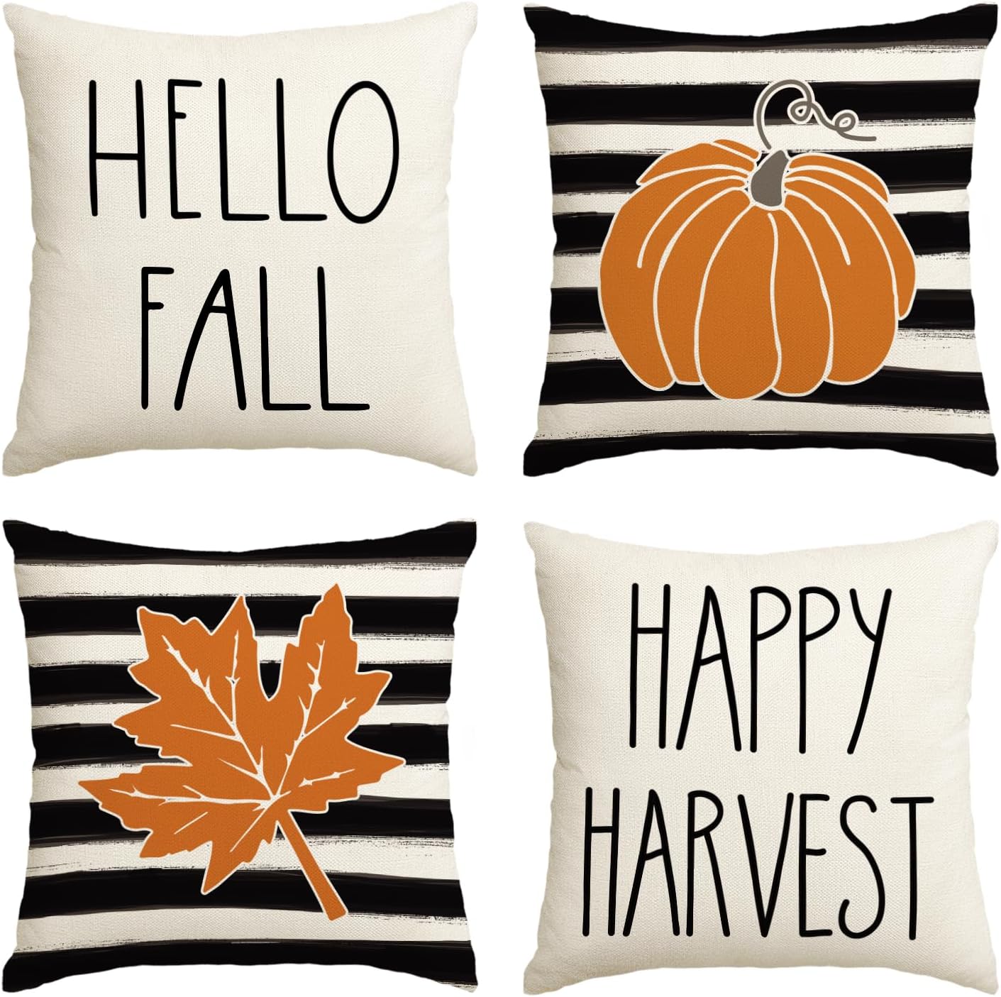 AVOIN colorlife Hello Fall Watercolor Stripes Pumpkin Leaf Throw Pillow Cover Happy Harvest, 18 x 18 Inch Autumn Thanksgiving Farmhouse Cushion Case for Sofa Couch Set of 4
