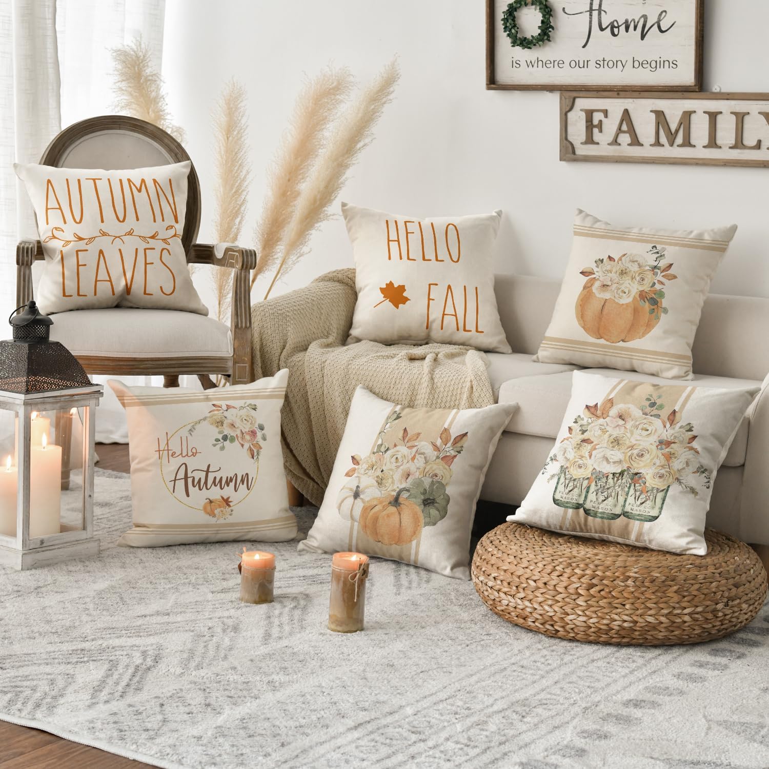 AVOIN colorlife Hello Autumn Flower Pumpkin Fall Throw Pillow Covers, 18 x 18 Inch Pillows Rose Leaves Jar Seasonal Cushion Case for Sofa Couch Set of 4