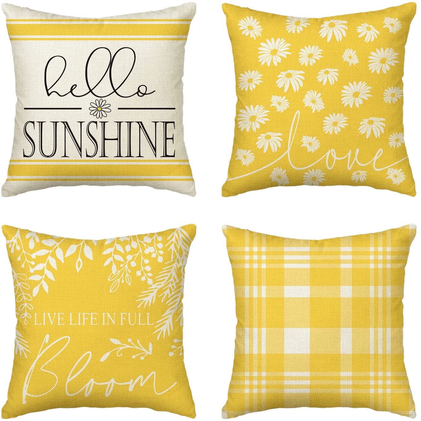 Hello Sunshine Live Life in Full Bloom Daisy Summer Throw Pillow Covers 18 x 18 Inch Set of 4 Yellow Square