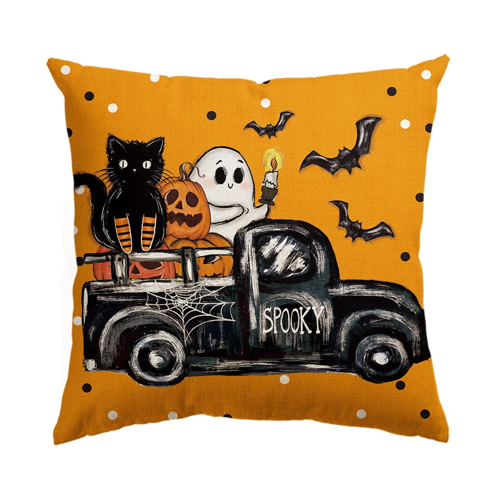 Jack-O'-Lantern Truck Ghost Black Cat Polka Dot Halloween Throw Pillow Cover 18 x 18 Inch Orange Decorative Outdoor Cushion Covers