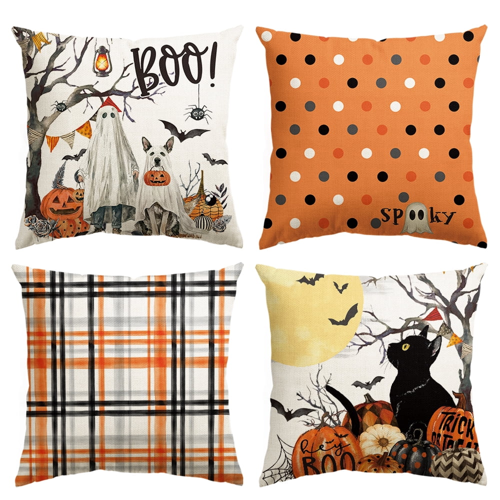 Polka Dot Striped Black Cat Boo Ghost Halloween Throw Pillow Cover 18 x 18 Inch Decorative Outdoor Cushion Covers Set of 4